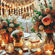 You can easily make your own centerpieces so affordably. Group mason jars, candles, fairy lights, or seasonal flowers together to bring about a pretty-looking table arrangement. Simple yet chic, these do-it-yourself centerpieces create a personal touch in the decoration. -